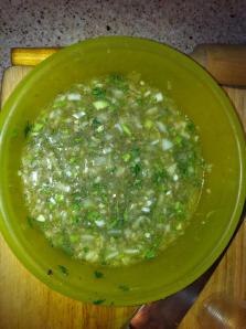 כעת, נשים את השום, הפלפל החריף, מלח ופלפל שחור בקערה ונמעך עד שנקבל עיסה. נוסיף את מיץ הלימון ונערבב עד שהמלח יימס. אחר כך נערבב פנימה את הבצלים, פטרוזיליה ושמן זית.