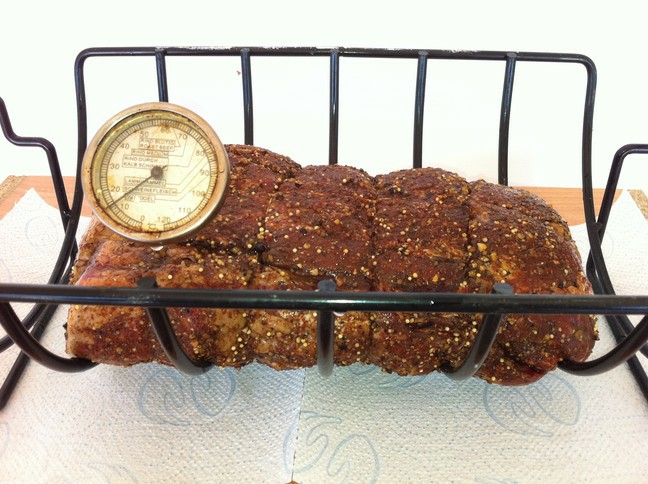 Кстати, заметьте оригинальнейший аксессуар для ростбифа — обнаружил его во время одной из своих поездок в Америку. Очень удобная штука — он работает и как «люлька» для больших кусков мяса, и, если его перевернуть, как стенд для жарки ребрышек.