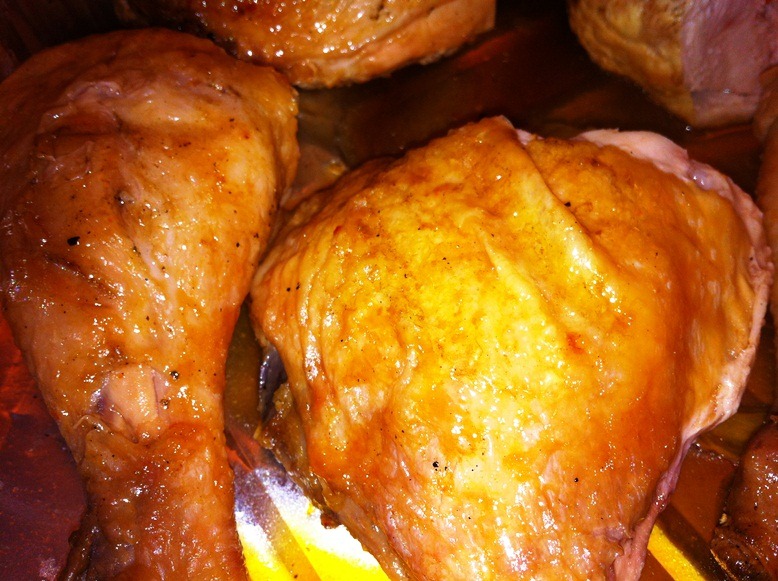 Перед жаркой курицу надо смазать кунжутным маслом и обсыпать немного солью. А вот в последние полчаса жарки надо смазывать курицу обильно нашим соусом-глазурью.
