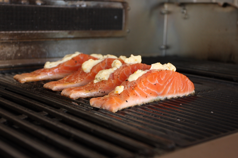 Итак, нашу сковоро… ой, пардон, планчу мы ставим на сильный огонь — нам нужно, чтобы металл разогрелся очень хорошо. После чего смазываем оливковым маслом. Им же, маслом, то бишь, смазываем и куски филе семги. Затем рыбу солим и перчим.