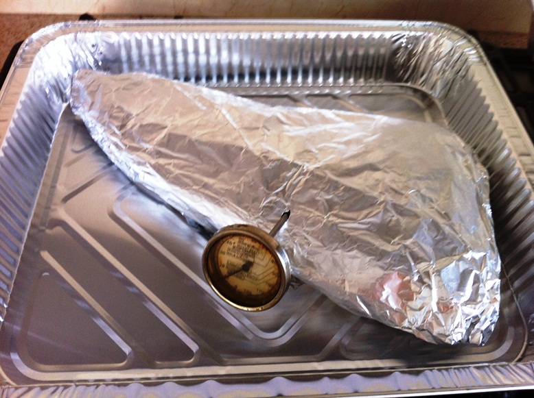 Итак, прошло в общей сложности 3 с половиной часа. Вытаскиваем мясо и даем ему постоять, не разворачивая, минут 15-20. Вот теперь — разворачиваем, и вот что перед нами: