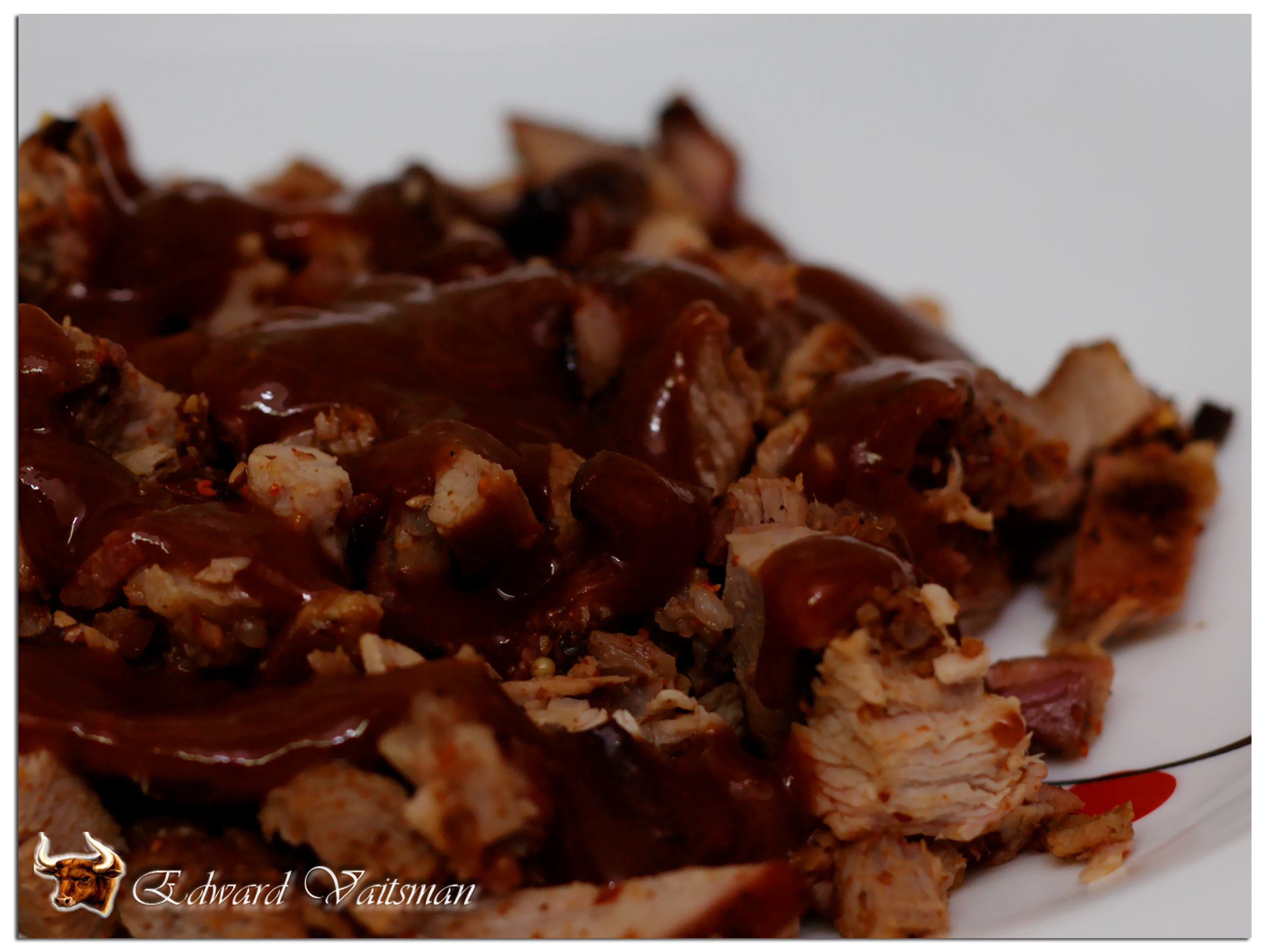 Все! Теперь — раздираем (в буквальном смысле, двумя вилками) мясо на мелкие кусочки и поливаем вашим любимым соусом барбекю. Я, как всегда, воспользовался своим, рецепт которого вы можете найти вот здесь.