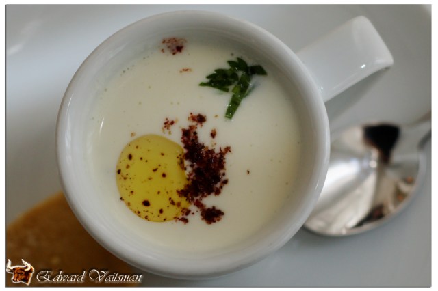 Я и моя коллега по перу Ольга намеренно выбрали разные блюда, чтобы получить как можно больше впечатлений от нового летнего меню. Итак — трапеза началась. Первым делом, как и заведено в классических элитных ресторанах, нам был подан амюз-буш (Amuse Bouche), что дословно означает «домашнее развлечение». В данном контексте — это блюдо, которое подается за счет ресторана, и его цель — предоставить гостю возможность оценить общее направление фантазии шеф-повара. Как бы, такая «затравка». В нашем случае нам подали суп на основе йогурта с отваренной чуть проросшей пшеницей (фрики). Принесли это чудо в чашечке для эспрессо.