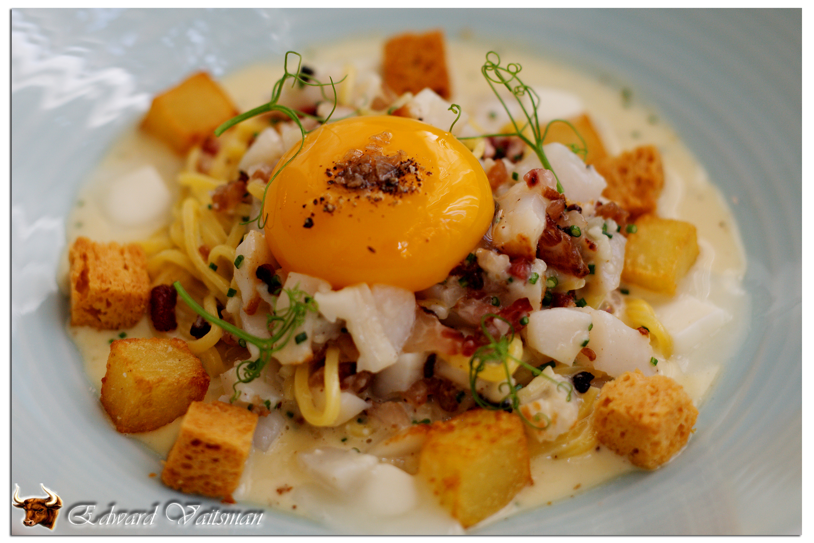 Настала очередь первых блюд. Я заказал то, что называется Scallop Carbonara. Это блюдо состоит из устрицы (той же, из которой готовится кокиль Сен-Жак), лингвини на основе желтков, бараньей панчетты, панна котты из пармезана, небольших сухариков и копченого яичного желтка.