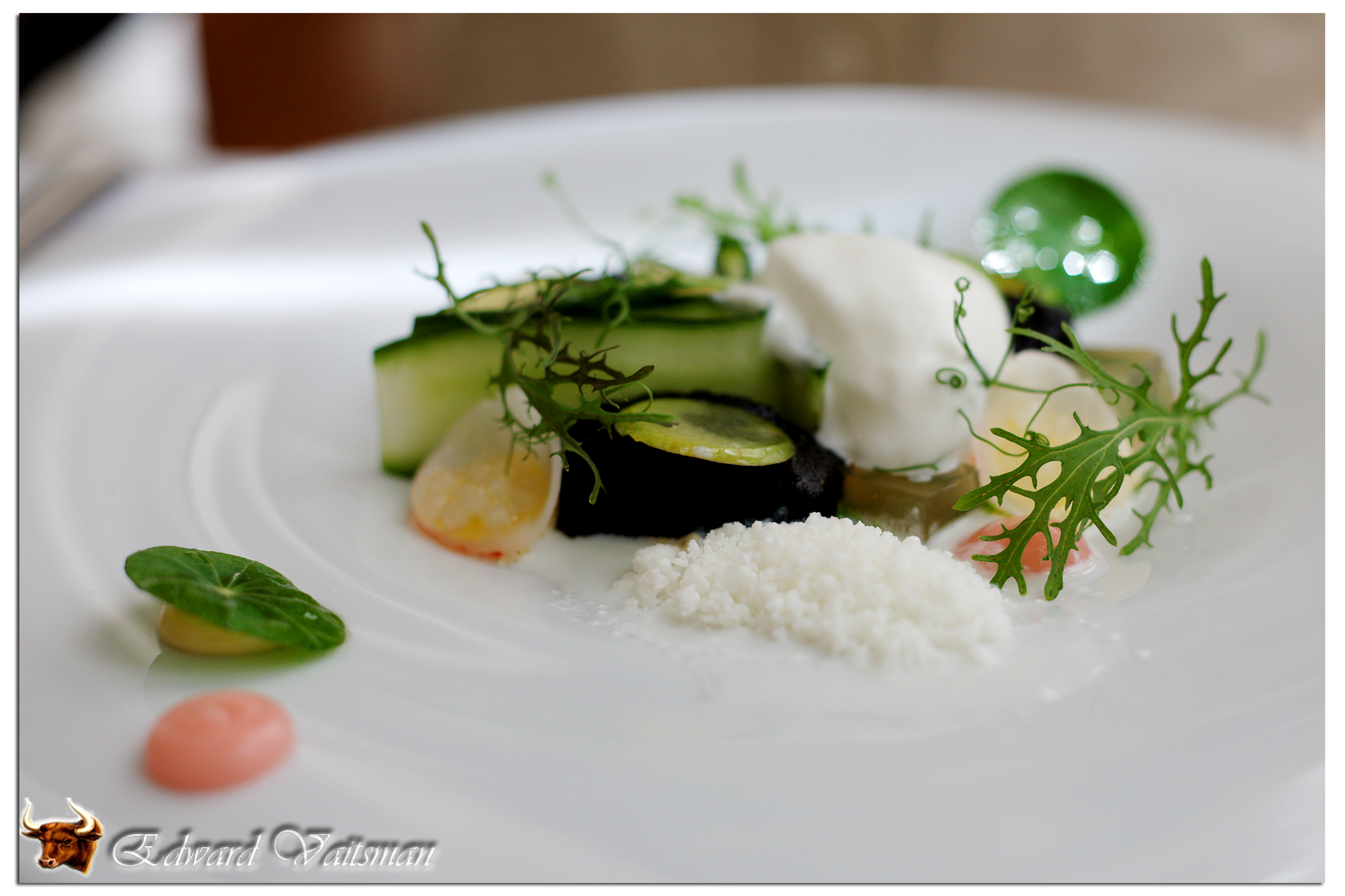 Моя спутница выбрала сашими из морской рыбы (в тот день это было красное мясо тунца). У меня заняло около 30 секунд понять, где в этом блюде кто, и где же, черт подери, прячется этот тунец :). Как оказалось, Меир подал тунца в пудре из водорослей нури (тех самых, из которых делается суши), поэтому он был полностью черным. Кроме того, это блюдо включает еще и огурец, дайкон (японская редиска), зеленую сливу, небольшие шарики из тапиока, желе из меда, хрена и перца чили, а также некоторые еще ингредиенты, о которых до сих пор я и представления не имел.