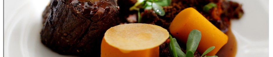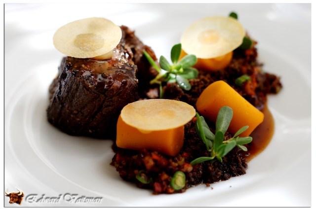 А вот это — говядина, приготовленная методом «су вид», т. е. медленная термообработка в вакуумной упаковке, а после того — обжаренная на гриле. Подается мясо с хрустящей киноа, пюре из бататы и еще кое-чем, что я просто не успел записать :). Это блюдо просто бешено вкусное. Меня давно интересовало, как же будет на вкус мясо, приготовленное таким методом. Вот и довелось попробовать, чего и вам рекомендую :).