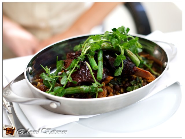 Основное блюдо… Перед вами — гусиная ножка конфи, поданная с грибами, пшеницей и турецким шпинатом, корнем петрушки, сливами в бренди под соусом из красного вина.