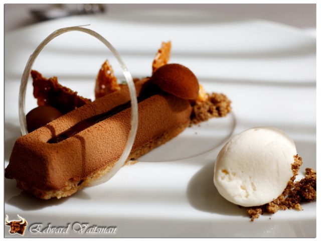 Вот в общем и все, что включает в себя цена бизнес ланча. Однако мы все же не удержались и от десерта. Цены десертов варьируются между 50 и 70 шекелями. Так вот, перед вами — манжери из шоколада Vahlrona, с вишнями Амарена, муссом из нугата, муссом из орехов кэшью, крамбл из орехов и тыквы, а также миндальный твиль и мороженое.